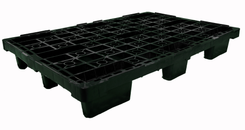 Palet de plástico disponible en color negro. Fabricado en polietileno extendido de alta densidad. Preparado para cargas dinámicas de 1000 kilogramos y estáticas de 2000 kilogramos, encajable sobre 9 tacos y apilable.